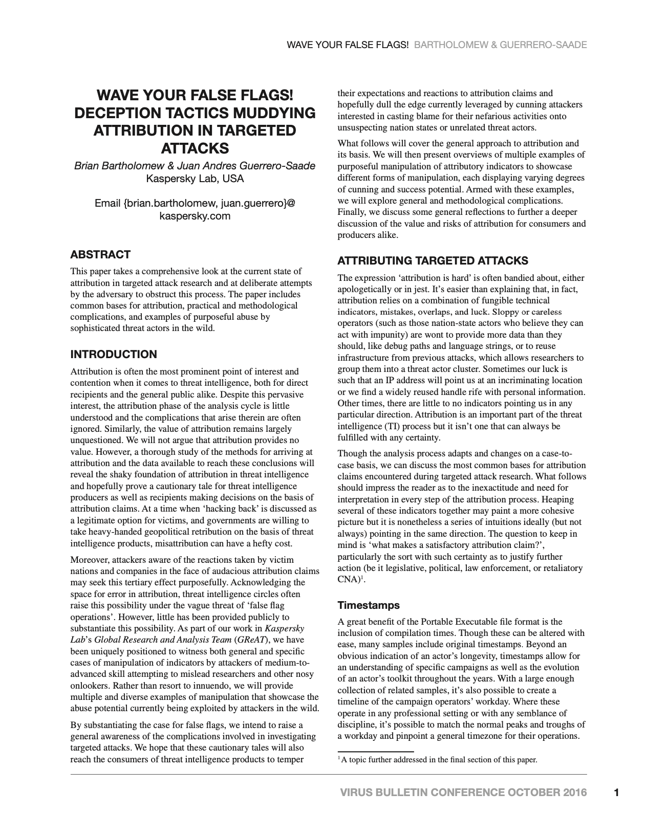 A timely discussion of the artifacts used to cobble together attribution and the ways in which threat actors are manipulating those indicators to throw us off their trail. The paper was written months before the ‘summer of Sofacy’ and provides an adequate conceptual framework to discuss realistic partial false flag operations.